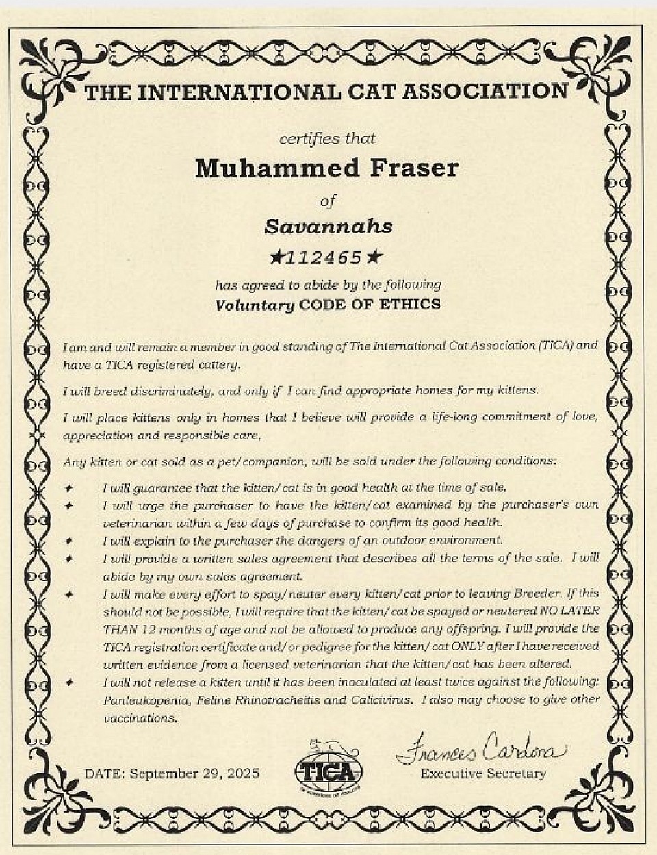 The cat/kitten described herein is registered with TICA/not registered with TICA and is sold on the active register subject to the following terms: