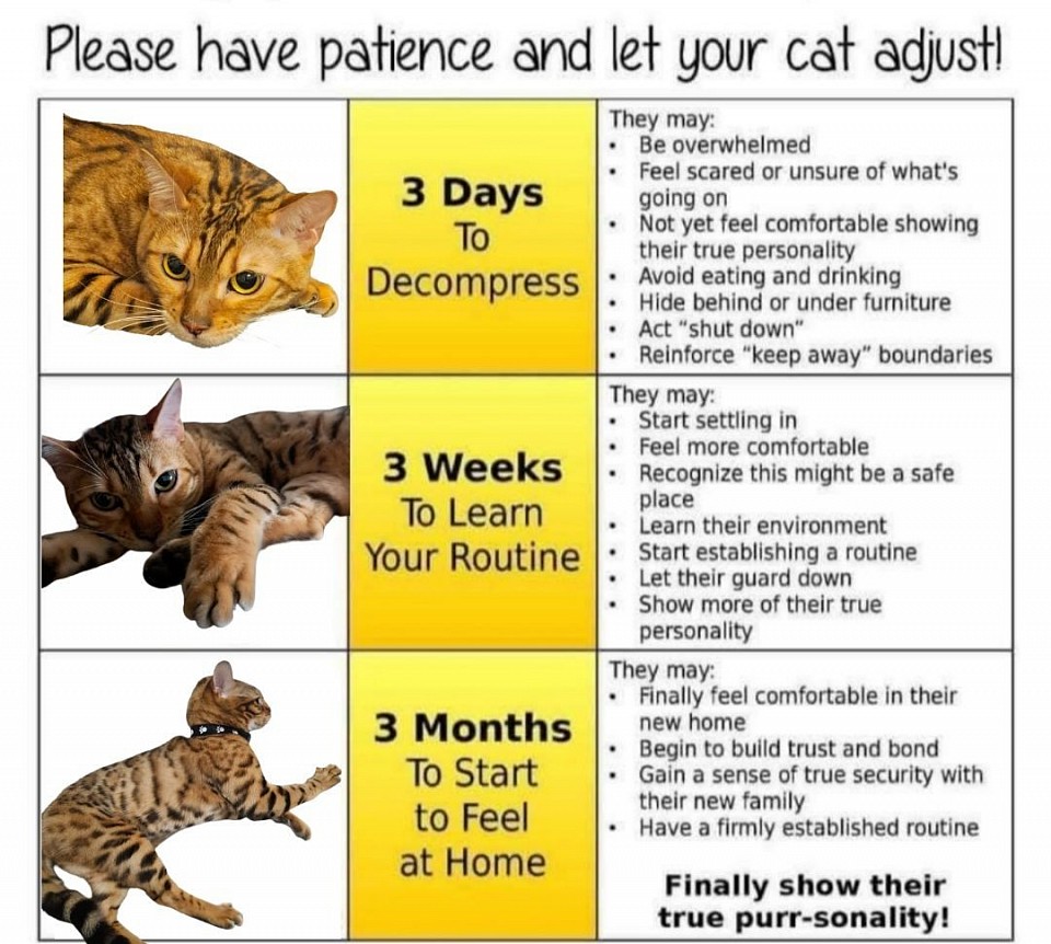 - 3 Weeks to Adjust: The cat will begin exploring its new surroundings and learning the household routine. Establishing consistent feeding and playtimes will help the cat feel comfortable and secure.